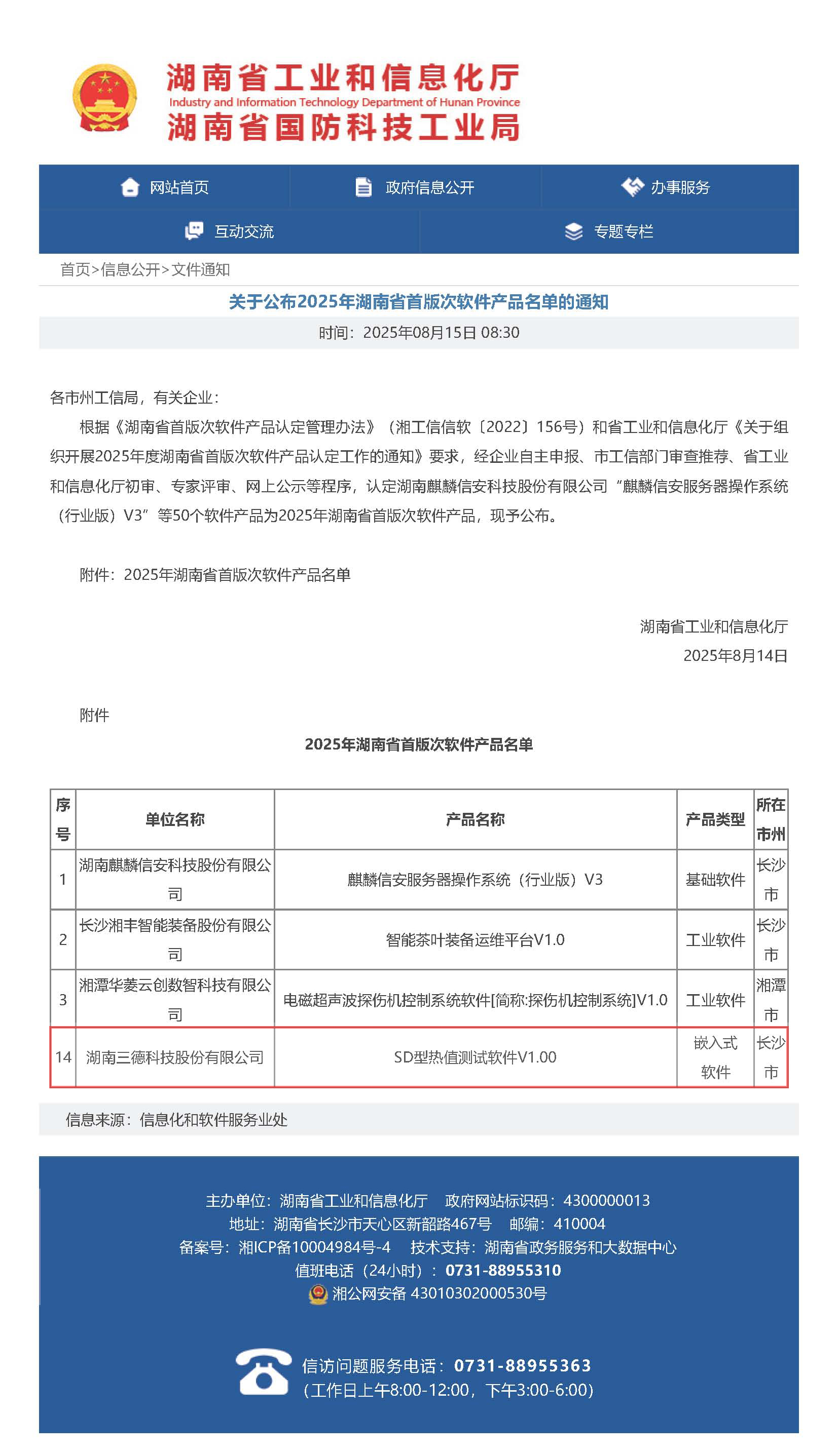 近日,湖南省工業(yè)和信息化廳公布《2025年湖南省首版次軟件產(chǎn)品名單》,三德科技自主研發(fā)的“SD型熱值測試軟件V1.00”成功入選。